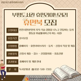 휴먼북 모집 관련 자세한 사항은 부평도서관 독서문화과로 문의하거나, 홈페이지를 참고하면 된다.