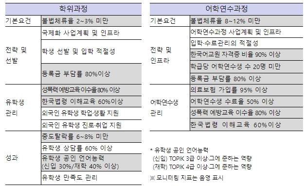 한편, 미인증대학에 대해서는 유학생 유치·관리 실태조사를 실시하여 일정기준을 충족하지 못하면 비자심사 강화대학으로 지정하여 유학생을 유치할 때, 어학 능력, 재정 능력 등 기준을 강화하여 관리한다. 또한 일정 기준을 충족했더라도, 표준입학허가서를 부정 발급한 대학의 경우, 비자 심사 강화대학으로 지정하는 등 유학생 유치·관리 부정 사례를 엄단하기 위해 지속적으로 노력하고 있다.