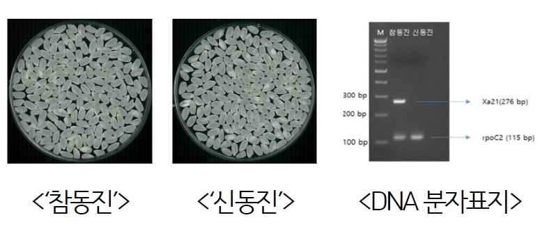다른 품종과의 혼입 여부를 가려 품종을 판별하는 기술 요구에 부응해 ‘참동진’과 ‘신동진’, ‘강대찬’ 등 중대립 품종들을 빠르고 정확하게 구별할 수 있는 디엔에이(DNA) 분자표지를 개발했다. 현재 국립농산물품질관리원에 기술 이전돼 ‘참동진’ 순도 및 품질 검정에 활용하고 있다.