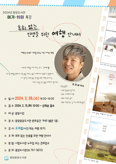 김미라 도서관과장은 “은퇴나 이직 등 새로운 도전을 해야 하는 세대들의 상황에 따라 이번 강연을 계기로 여행을 통해 다양한 경험과 인간관계를 얻고 삶의 방향성을 찾아가길 바란다”고 말했다.