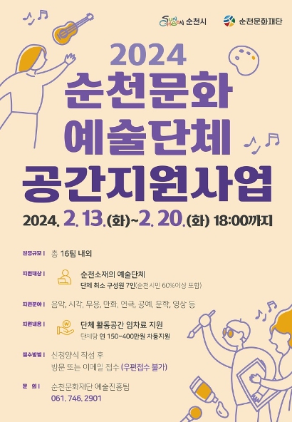 ![]() (재)순천문화재단, ‘2024 순천문화예술단체 공간지원사업’ 참여 단체 모집 |