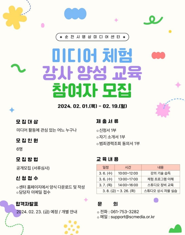 ![]() 순천시영상미디어센터, ‘미디어 체험 강사 양성 교육’ 참여자 모집 |