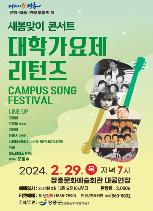 이에 장흥군의 첫 번째 문화공연으로 새봄맞이 콘서트 '대학가요제 리턴즈'를 오는 2월 29일 오후7시 장흥문화예술회관 대공연장에서 개최한다.