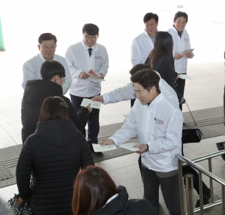 ![]() 8일 오후 목포역에서 김대중 전남교육감 및 직원들이 역을 빠져나오는 시민들에게 홍보 리플릿을 전달하고 있다. |