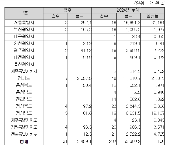 집행 예정인 31건 중 27건은 지역제한 입찰 또는 지역의무 공동도급 대상공사로, 954억 원 상당(28%)을 지역업체가 수주할 수 있을 것으로 예상된다. 지역제한 입찰은 12건(440억 원), 지역의무 공동도급공사는 15건(514억 원 상당 지역업체 참여 전망)이다.