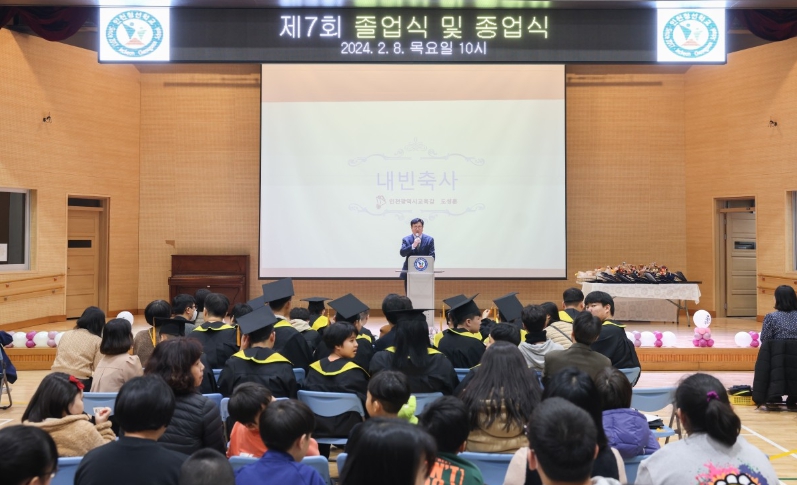 인천청선학교는 유치원, 초등학교, 중학교 교육과정을 운영하는 특수학교다. 올해는 제7회 졸업식으로, 총 67명(유치원 6명, 초등학교 25명, 중학교 36명)의 학생이 졸업했다.