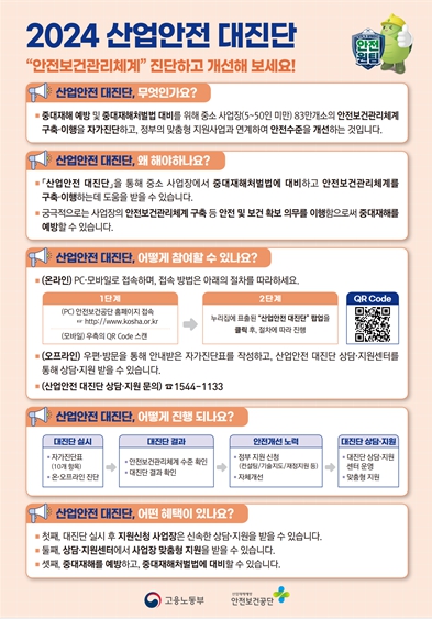 고용노동부에서 4월 말까지 집중 추진하는 산업안전 대진단은 상시 근로자 50인 미만의 사업장을 대상으로 안전보건 경영방침·목표, 인력·예산, 위험성 평가 등 10개 항목의 진단 결과에 따라 기술 지도 및 재정 지원 등을 맞춤형으로 지원한다.
