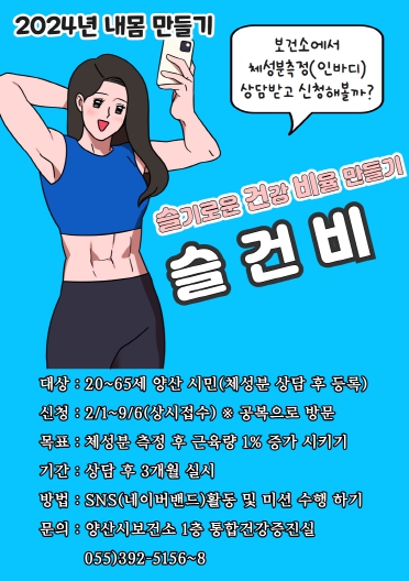 신청자는 사전설문조사와 체성분측정 및 혈압·혈당검사를 받고 12주동안 식생활 및 신체활동 관리를 스스로 실천하면서 보건소와 함께 대면교육(6주과정) 및 SNS활동을 수행하여 ‘체지방 1% 감량’,‘근육량 1% 증가’목표를 달성하면 건강관리용품을 제공받는다.