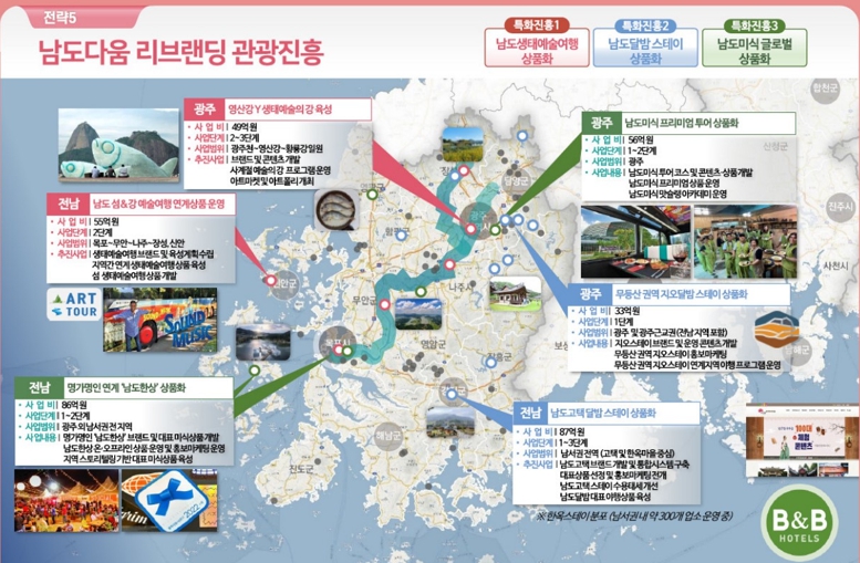 지난 2일에는 22개 시군 관광과장 회의를 개최, 남부권 광역관광개발사업 추진 상황을 점검하며 설계 착수 전 시군비를 신속히 확보해줄 것과 기본계획 수립 마무리 등 협조를 당부했다. 애로사항을 공유하고 대응 방안으로 지역 관광전문가, 전국 규모의 전문가 자문도 지원하기로 했다.