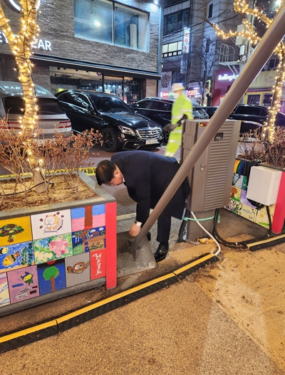 박강수 마포구청장은 홍대 레드로드를 살피던 중 조명 지지대가 기울어져 있는 위험한 상황을 발견해 즉시 조치하고, 밤 10시까지 보행에 위협이 되는 적치물 등을 제거하며 안전사고 예방에 총력을 기울였다.