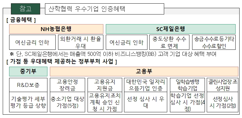 산학협력 우수기업으로 인증을 받으면 기업은 여신금리 인하(0.1~0.3%), 각종 수수료 할인 등 금융혜택과 정부부처 사업 신청 시 가점 부여 등의 우대혜택을 받게 되며, 선정일로부터 2년간 인증 효력이 유지된다.