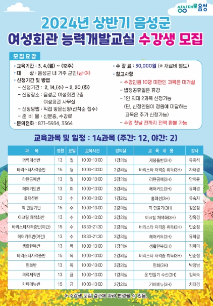 3월 4일부터 12주간 진행되는 이번 교육은 음성군에 주소지를 둔 여성·남성 누구나 신청 가능하며, 접수 기간 내 신분증을 지참해 음성군 여성회관(2층)을 방문·신청하면 된다.