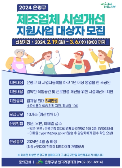 ![]() 은평구, 제조업체 시설개선 지원사업 참여자 모집 |