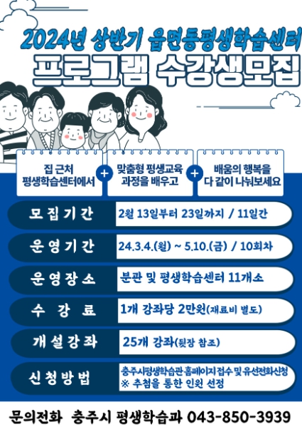 ![]() 충주시, 읍면동평생학습센터 프로그램 수강생 모집 |