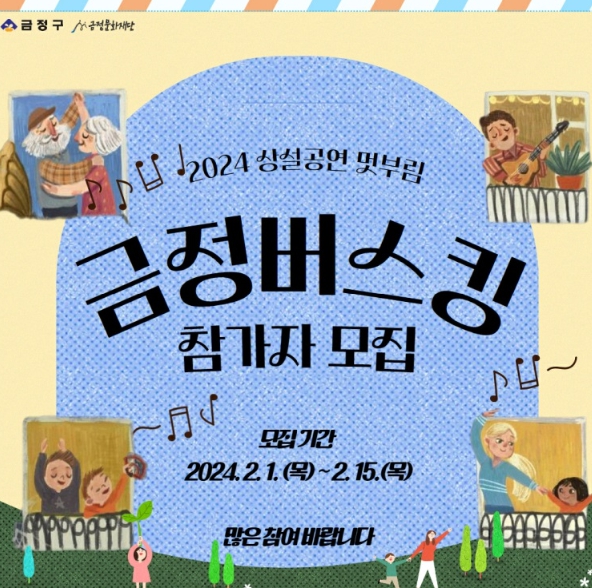 ![]() 부산시 금정문화재단, 2024상설공연멋부림 '금정버스킹' 공연 참가자 모집 |