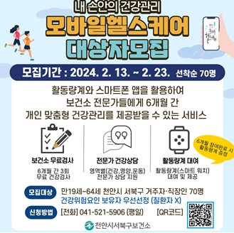 ![]() 천안시 서북구보건소, 모바일헬스케어 사업 대상자 모집 |