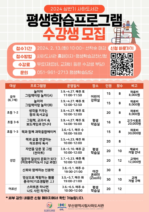 참가 희망자는 2월 13일 오전 10시부터 사하도서관 홈페이지에서 선착순으로 신청하면 된다. 수강료는 무료이고 교재 및 재료비는 본인 부담이다.