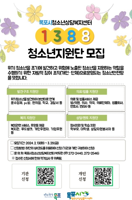 ![]() 목포시청소년상담복지센터, 1388청소년지원단 모집 |