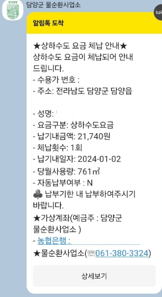 이를 통해 상수도 사용량, 체납액 등의 내용을 카카오톡과 문자로 제공해 시간, 장소에 구애받지 않고 휴대전화로 편리하게 확인하고 요금 또한 모바일(카카오톡)로 쉽게 납부할 수 있다.