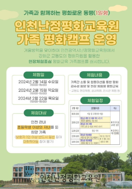 난정평화교육원 관계자는 “강화군 교동도의 지역적, 역사적 특색을 활용한 평화체험 교육을 통해 방학 중 가족과 함께 의미 있는 추억을 만들고 평화감수성을 높여 일상에서 평화를 실천할 수 있는 다양한 교육을 운영할 계획”이라고 말했다.