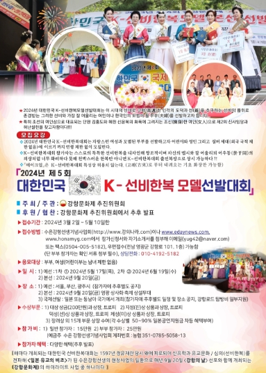 ![]() 2024년 제5회 K-선비한복모델선발대회 참가자 모집 |