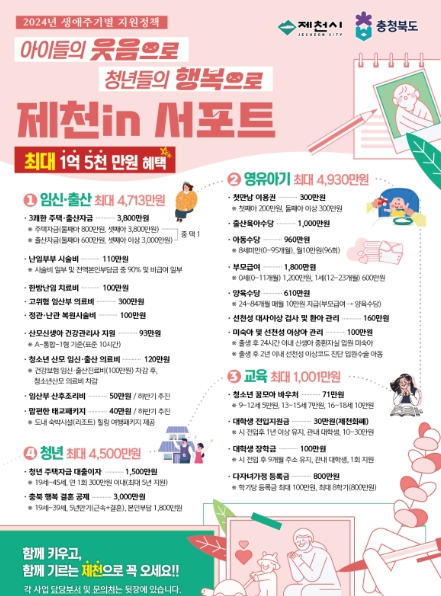 시에 따르면 제천에서 아이를 출산하고 영유아, 학창시절, 청년자립까지 각 분야에 걸쳐 시에서 지원하는 직·간접 지원금은 국·도비, 시비 지원사업을 포함하여 1인 최대 1억 5천만원 가량이다.