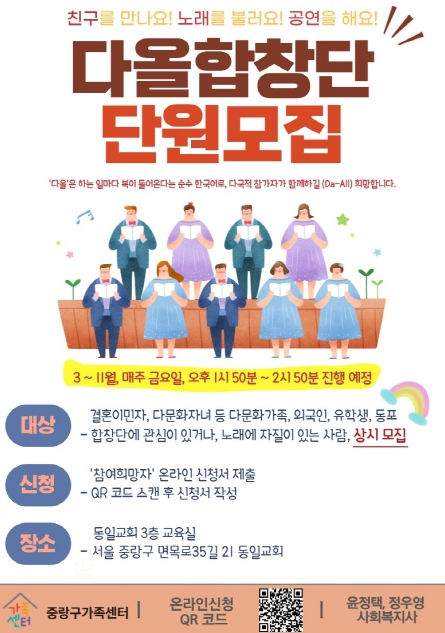 ‘다올합창단’은 결혼 이주 여성, 다문화가정 자녀, 외국인, 유학생 등 이주민들의 유대관계 강화와 안정적인 정착을 돕는 중랑구만의 지역공동체 활성화 사업이다. 지역 주민과 이주민이 합창을 매개체로 교류하며 서로를 이해하고 같은 사회구성원으로서 소통할 수 있도록 마련됐다.