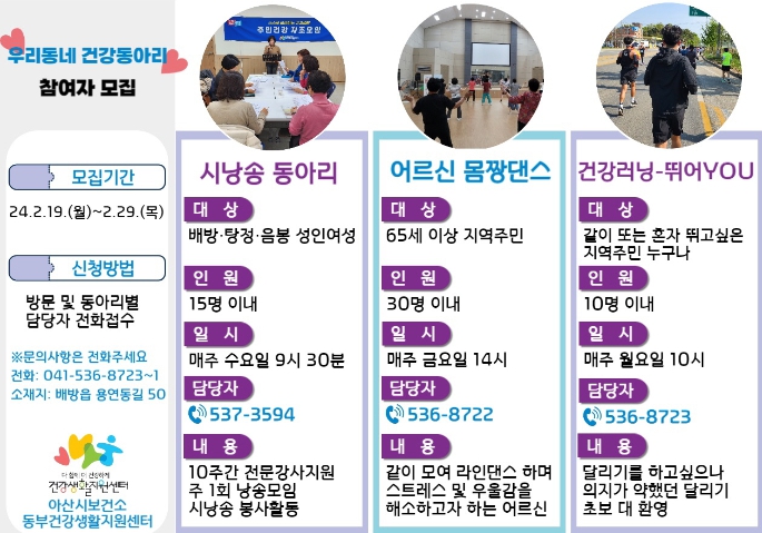 동아리 신청은 19일부터 방문 또는 전화로 가능하며, 기타 자세한 사항은 동부건강생활지원센터로 문의하면 된다.
