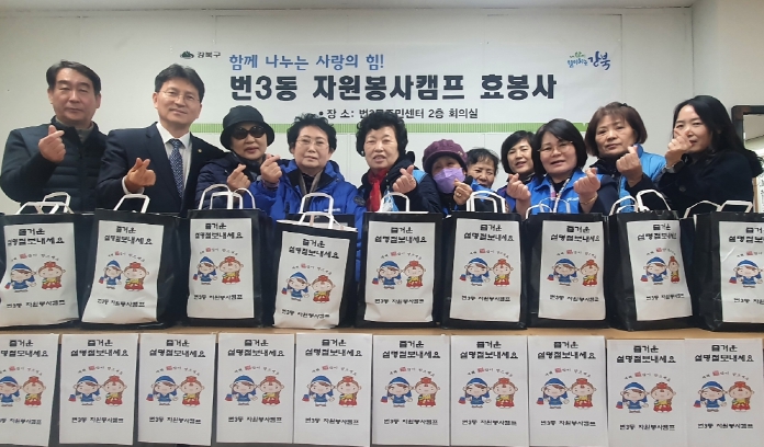 ![]() 번3동 자원봉사캠프 회원들이 홀몸 어르신을 위해 지난 7일 ‘설맞이 효봉사’를 진행했다. (왼쪽부터 천태석 번3동장, 최치효 강북구의회 의장, 정영애 번3동 자원봉사캠프장(네 번째)와 회원들) |