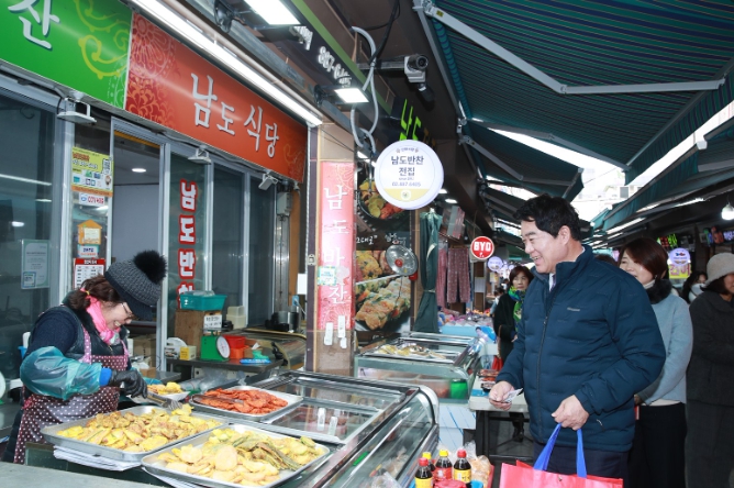 ![]() 설 명절을 앞두고 인헌시장을 찾아 상인들과 인사를 나누는 박준희 구청장 |