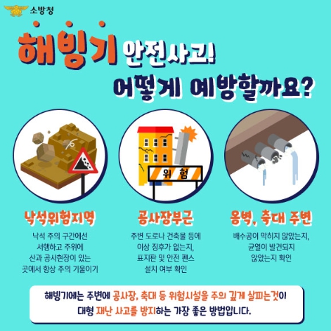 해빙기에는 겨울철 얼어 있던 지반과 얼음이 녹으면서 균열 및 지반침하가 발생하게 되어 낙석과 담장, 옹벽 등이 붕괴될 가능성이 있고 저수지 등을 덮고 있던 얼음의 두께가 얇아지면서 사고의 발생 위험성이 증가하기 때문에 각별한 주의가 필요하다.