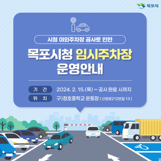 시는 주차타워 건립공사에 따른 야외 주차장 폐쇄로, 민원인과 직원들의 주차 불편사항 개선하기 위해 목포교육청과 협의해 구)청호중학교 운동장에 임시장주차장 220면을 설치완료했다.