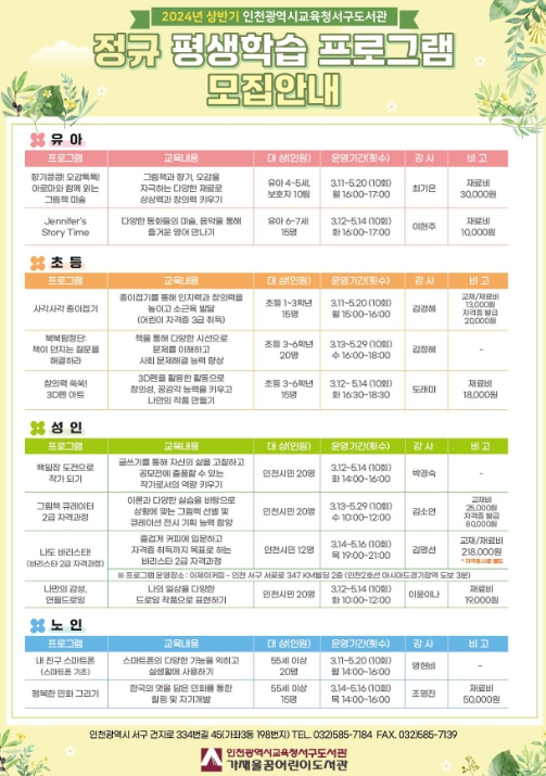 서구도서관 관계자는 “인천시민이 생애주기별 맞춤 프로그램 수강을 통해 학습 욕구를 충족하고 개인의 역량을 강화하길 바란다”며 “언제, 어디서나 학습할 수 있는 체계를 만들고 함께 성장할 수 있도록 도서관이 중심축 역할을 하겠다”고 말했다.