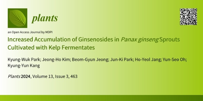 이는 단계적으로 다시마 배양액의 새싹삼 생산 적용시 생물전환 전구물질(PPD형 진세노사이드) 함유량이 증가하는 연구 결과로 이어졌으며, SCI 국제학술지에 논문이 실리는 성과를 거뒀다.