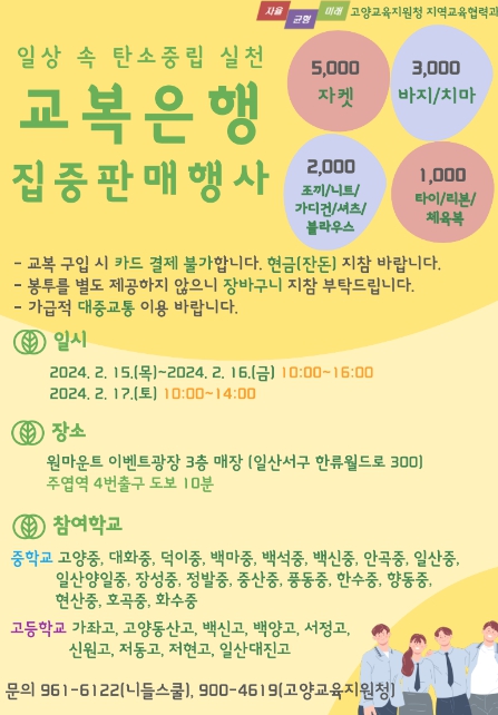 교복은 체육복 등 부속품 1천원부터 동복 자켓 5천원까지 현금으로만 구입 가능하며, 올해는 고양중 외 26개교가 참여한다. 자세한 사항은 고양교육지원청 홈페이지 팝업창에서 확인할 수 있다.
