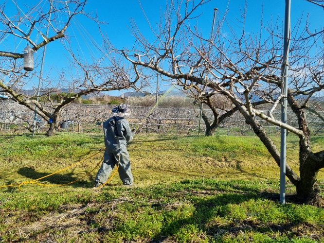 ![]() 복숭아 동계 방제 : 복숭아 과원에 동계방제 약제 살포 모습 |