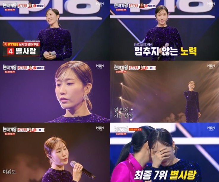 결승 파이널 주제는 ‘현역의 노래’였고, 화려한 스팽글 드레스룩으로 매혹미를 장착한 별사랑은 남진의 ‘미워도 다시 한번’을 선곡했다.