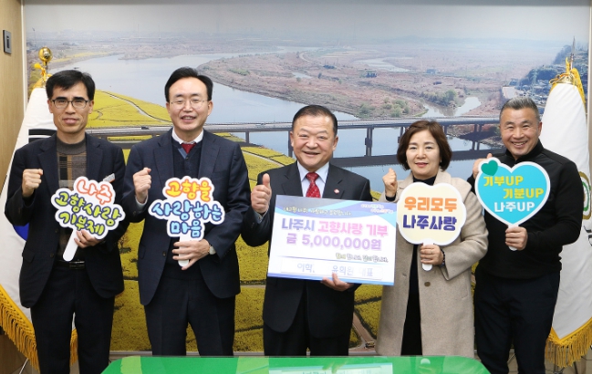 ![]() 이학갈비 윤희원 회장(사진 가운데)이 지난해에 이어 올해도 나주시에 고향사랑기부금 500만원을 기탁 했다. |