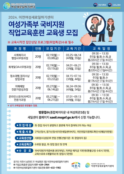 ![]() 2024년 이천여성새로일하기센터 직업교육훈련생 모집 |