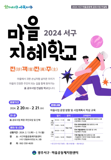 아울러 서구는 마을공동체의 지속적인 성장을 돕고 사업의 내실화를 위해 오는 20~21일 마을지혜학교를 개최한다. ‘진객(珍客)진주(眞主);마을의 귀한 손님이 마을의 진정한 주인으로 거듭난다’는 주제로 진행되는 마을지혜학교는 현장활동가들을 강사로 초청해 서구마을활동이 나아가야 할 방향 및 실제 사례를 통한 계획서 작성 방법 등을 자세히 안내할 예정이다. 서구는 또 공모사업 접수기간에 모임‧단체별로 1대1 맞춤형 사업계획 작성 컨설팅도 진행한다.