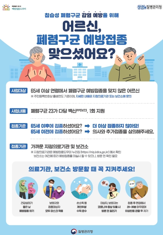 올해 접종 대상은 65세 이상 나이에서 폐렴구균 23가(PPSV23) 다당백신을 한 번도 접종하지 않은 어르신으로 주소지와 관계없이 지정의료기관을 방문하면 1회 무료로 접종할 수 있다.