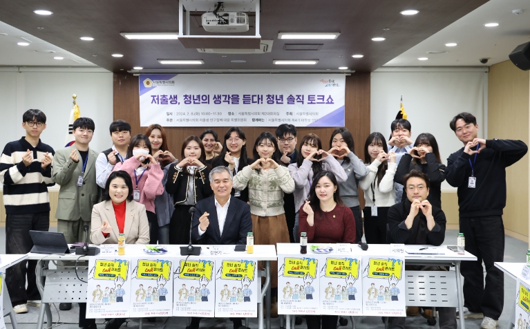 지난 2월 6일 서울특별시의회 저출생·인구절벽대응 특별위원회 박춘선 위원장(강동3, 국민의힘)은 결혼과 출산에 대한 청년들의 솔직한 이야기를 듣는 ‘저출생, 청년의 생각을 듣다! 청년 솔직 토크쇼’를 마련했다. 이날 토크쇼에는 서울특별시의회 제4기 대학생 인턴십 참여 학생 15명과 김현기 서울특별시의회 의장, 강석주 보건복지위원장, 이효원 의원(비례, 국민의힘), 박유진 의원(은평3, 더불어민주당), 그리고 IWCA (Institute of Current World Affairs)에서 파견된 Prachi Vidwans가 함께 자리해 청년들의 솔직한 이야기에 귀 기울이는 시간을 가졌다.