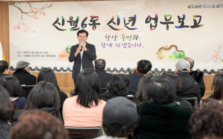![]() 지난 1월 신월6동 신년 동 업무보고회에서 구민과 소통중인 이기재 양천구청장 |