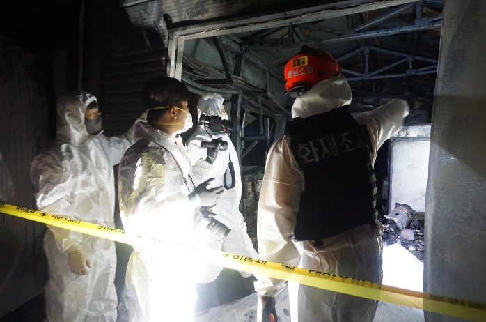![]() 화재 현장에서 합동 감식 중인 화재조사관 |
