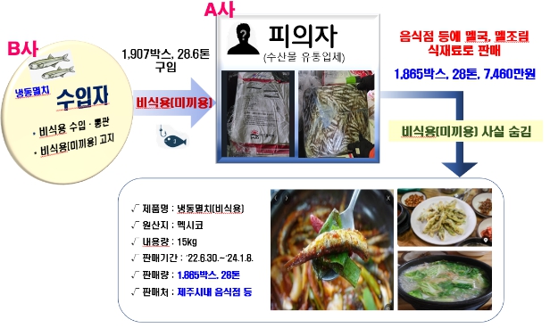 수사결과, 수산물 유통업체 A사는 2022년 6월경 국내 식용 멸치의 공급이 부족해지자 경제적 이득을 취하기 위해 수입업체 B사로부터 비식용 냉동멸치를 구매한 후, 음식에 사용하는 식용 멸치로 둔갑시켜 제주 시내 일반음식점 등에 판매했다.