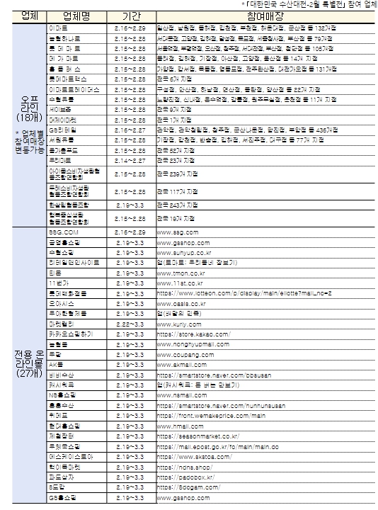 「대한민국 수산대전-2월 특별전」은 2월 15일부터 3월 3일까지 소비자들이 마트와 온라인몰에서 국산 수산식품을 구매할 때 구매 금액의 최대 50%(정부 20%+참여 업체 20~30%)를 할인 지원하는 행사이다. 이번 행사는 명태, 참조기, 고등어, 오징어, 마른 멸치 등 물가 관리 품목과 더불어 우럭, 바다장어 등 국산 수산물을 대상으로 진행한다. 행사에는 18개 마트, 27개 온라인몰에서 참여한다. 또한, 대한민국 수산대전 공식 누리집에서도 확인할 수 있다.