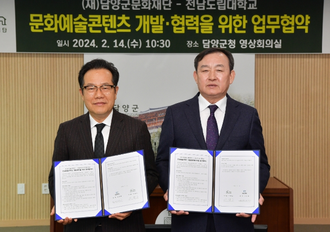 협약의 주요 내용은 담양군문화재단에서 운영하는 문화예술 사업과 대학에서 운영하는 교육 프로그램을 상호 협의해 ▲지역민과 생활문화 예술단체 대상 문화예술 프로그램 개발, ▲거점문화 공간을 활용한 공연과 교육 활동 연계, ▲상호 기반 시설 간 연계 구축 등으로 구성됐다.