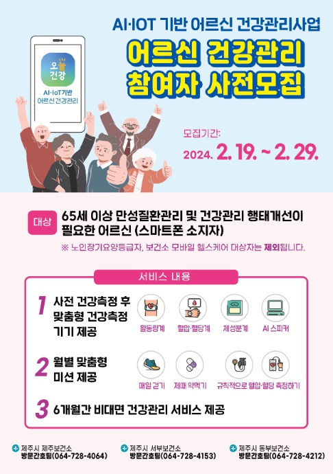 이 사업은 “오늘 건강” 앱과 블루투스 기반 건강측정기기를 활용한 비대면 건강관리 서비스로, 참여자 600명(제주보건소 300명, 서부․동부보건소 각 150명)을 선착순 모집해 3월부터 사업을 본격적으로 운영한다.