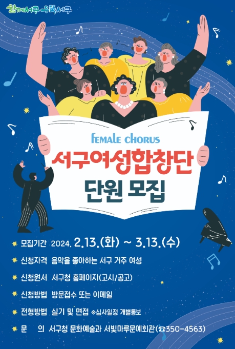 서구에 거주하는 주민으로 노래에 관심이 있고 지역사회를 위해 봉사할 수 있는 여성이면 누구나 지원 가능하며, 모집 분야는 소프라노·메조소프라노·알토 총 3개이다.