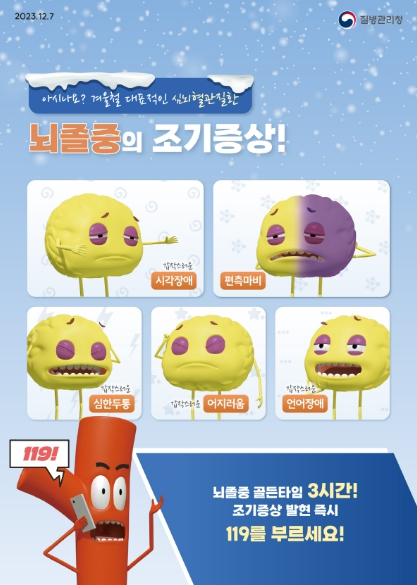 특히 겨울철은 급격한 기온 변화로 심뇌혈관질환 위험성이 다른 때보다 높은 계절로, 겨울철 대표적인 심뇌혈관질환인 심근경색과 뇌졸중의 조기증상을 미리 숙지하고 대비하는 자세가 필요하다.
